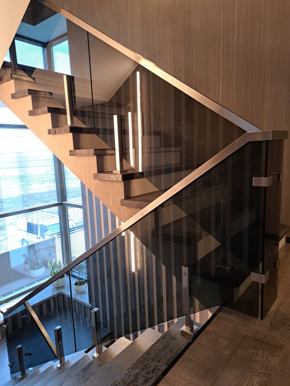 Дополнительно можно заказать подсветку стекла, поручня или министоек.