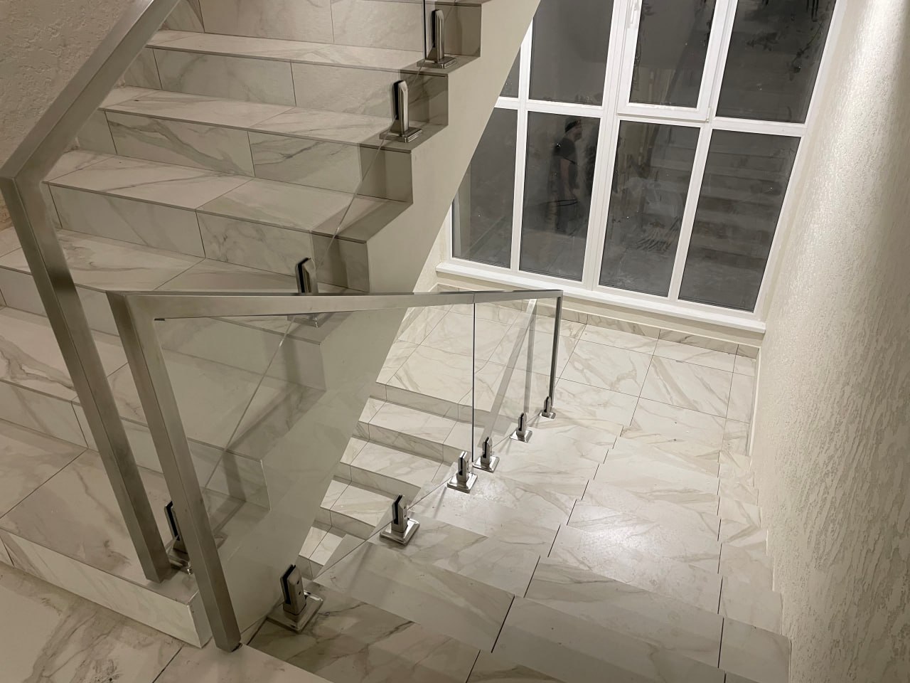 Красивая опция – частичная матировка нижней части несущего стекла. Делают обычно там, где стекло примыкает к лестничному маршу или перекрытию.